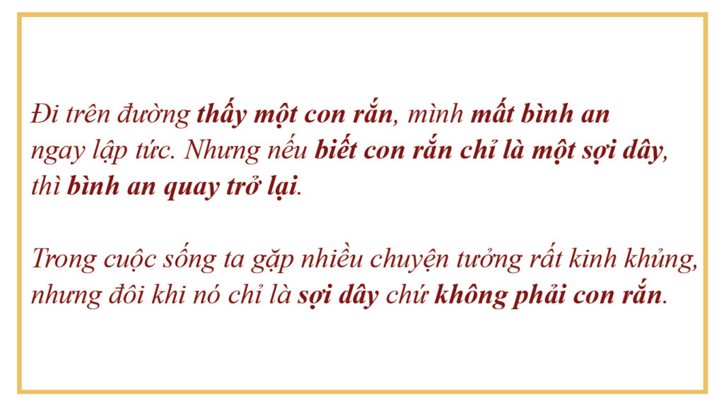 Bây giờ anh đang ăn kem, anh đang thấy thích thôi, thế tự nhiên đang ngồi, ai đấy ném cái điện thoại vào đầu anh, lúc đấy người nào nhảy vào chửi anh, thì nó cũng không an lạc. Hoặc một cái thông tin gì đấy bất lợi đến với mình, thì cái cảm giác an lạc đấy làm sao để mà giữ trong trạng thái ổn định được? Em đến đây muốn biết làm thế nào để trong tương lai có những sự việc tác động đến mình, mà mình vẫn giữ được giây phút an lạc cho mình.