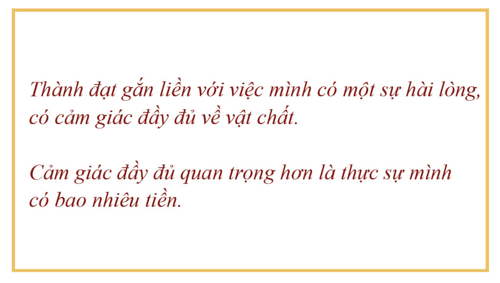 Nên là bây giờ con số rất khó nói. Nhưng rõ ràng ở đây có một ý tốt là có một sự thỏa mãn về vật chất. Tức là mình có một cái gọi là sự thoải mái về số vật chất mình kiếm được. Mình có một khả năng kiếm tiền nhất định và mình thoải mái về nó. Giống như có người nghĩ rằng “tôi chỉ cần nuôi được mẹ và nuôi tôi thôi”, có người nghĩ rằng “tôi phải được cả xã hội này công nhận”. Như vậy thành đạt ở đây có phần là tôi hài lòng với số tiền tôi kiếm được, được không ạ? Tôi cảm thấy hài lòng hay đầy đủ với số tiền mình kiếm được. “Số tiền mà tôi kiếm được tạo cho tôi cảm giác đầy đủ” – có gọi là thành đạt được không ạ? Còn bao nhiêu mình chịu rồi, không thể nói được! Số tiền tôi kiếm được tạo cho tôi một cảm giác đầy đủ. Có thể tính là một tiêu chuẩn.