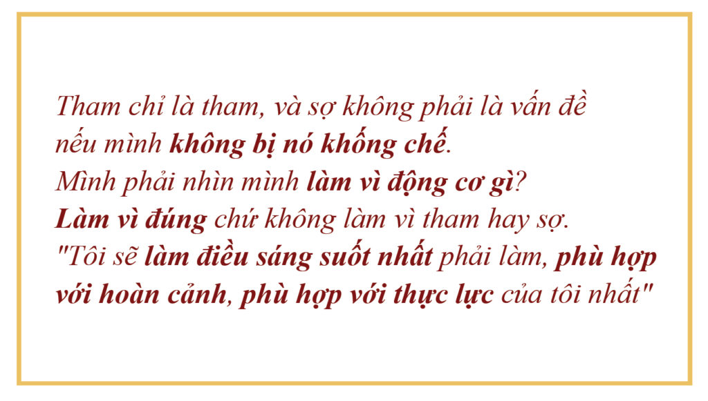 Nếu mà em quyết định vứt 100 triệu xuống để đối thủ không vượt lên mình, đấy là vứt 100 triệu xuống để bớt sợ. Em hiểu ý anh nói không? Còn nếu vứt 100 triệu xuống để làm đẹp hơn, tốt hơn, hàng em bán được nhiều hơn thì em vứt 100 triệu xuống để làm điều đúng. Mặc dù hành động bên ngoài giống hệt nhau, cũng là vứt 100 triệu chẳng khác gì nhau cả, nhưng em hoàn toàn có một sự bình an khi quyết định, khác với trước đây là quyết định vì sợ.